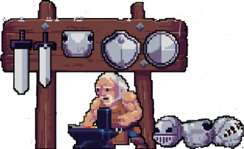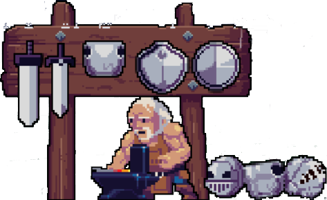 The Blacksmith is the first upgrade in Rogue Legacy. The Blacksmith sells armor and weapons. The blacksmith has 15 items for each equipment category, including swords, helmets, chestplates, limbs, and capes. You must find blueprints from chests to unlock more equipment, and purchase them to be able to equip them (more than 1 playthrough is needed to acquire all the blueprints). The Blacksmith will only start with Squire Sword, Squire Helm, and Squire Limbs unlocked, though they must still be purchased to be used.